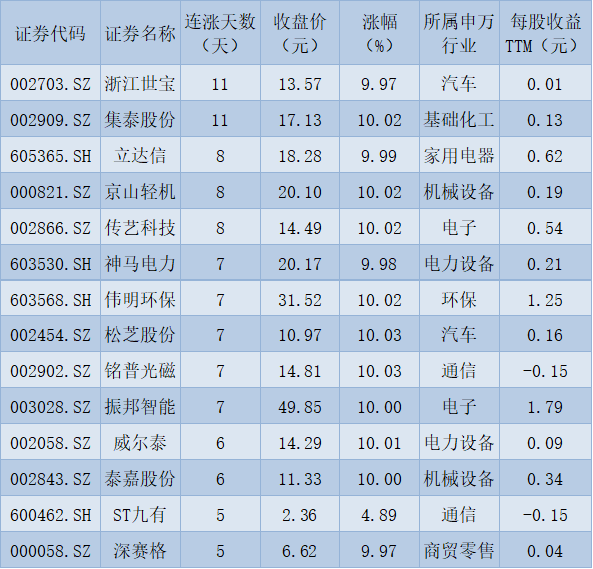 表:連續上漲5天且今日收盤漲停股一覽
