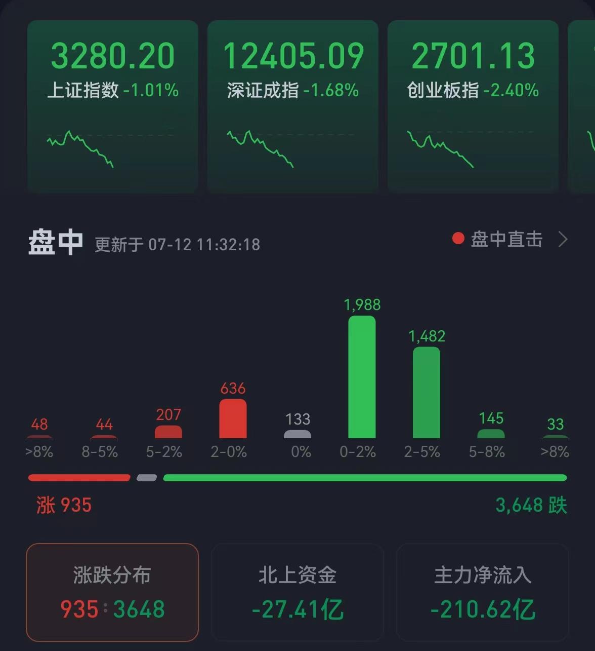 周二(7月12日),三大股指震蕩回落,全線(xiàn)收陰,跌幅均超1%。截至上午收盤(pán),上證指數(shù)跌幅達(dá)1.01%,報(bào)3280.2點(diǎn),失守3300點(diǎn)整數(shù)關(guān)口;深證成指和創(chuàng)業(yè)板指跌幅分別為1.68%和2.40%;滬深兩市合計(jì)成交額6183.5億元;總體來(lái)看,兩市個(gè)股跌多漲少,上漲個(gè)股935只,有3648只個(gè)股下跌。