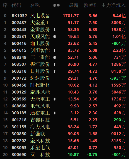 從領(lǐng)漲的風(fēng)電設(shè)備行業(yè)看,截至7月15日11:30,行業(yè)交易中的20只個(gè)股,有19只上漲,有6只個(gè)股漲幅超5%。從資金流向看,風(fēng)電設(shè)備行業(yè)上午大單資金凈流入額達(dá)6.44億元,居各行業(yè)第5位。