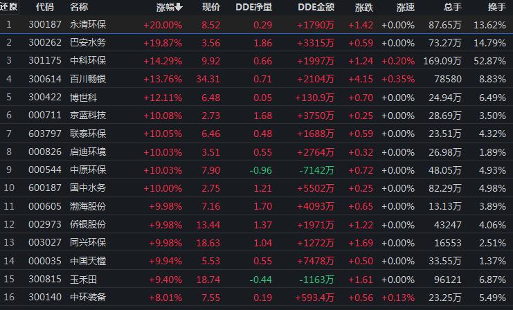 7月18日,環(huán)保行業(yè)漲幅居前,達4.59%。其中,包括中原環(huán)保、聯(lián)泰環(huán)保、永清環(huán)保、國中水務(wù)、渤海股份、京藍科技、同興環(huán)保、巴安水務(wù)等在內(nèi)的12只環(huán)保股集體漲停。