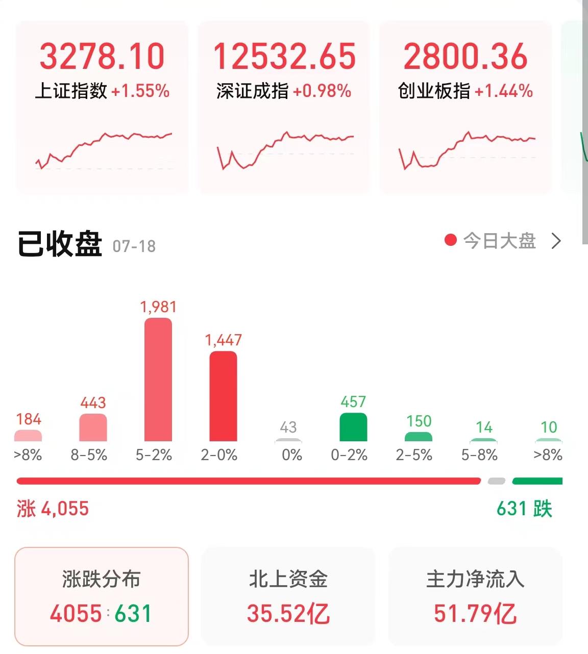 7月18日,三大股指全線上漲,截至收盤,上證指數(shù)漲幅1.55%報3278.1點,深證成指漲幅0.98%報12532.65點,創(chuàng)業(yè)板指漲幅1.44%報2800.36點;兩市合計成交10214億元,北向資金凈買入35.52億元。總體來看,兩市個股漲多跌少,超4000只個股實現(xiàn)上漲。