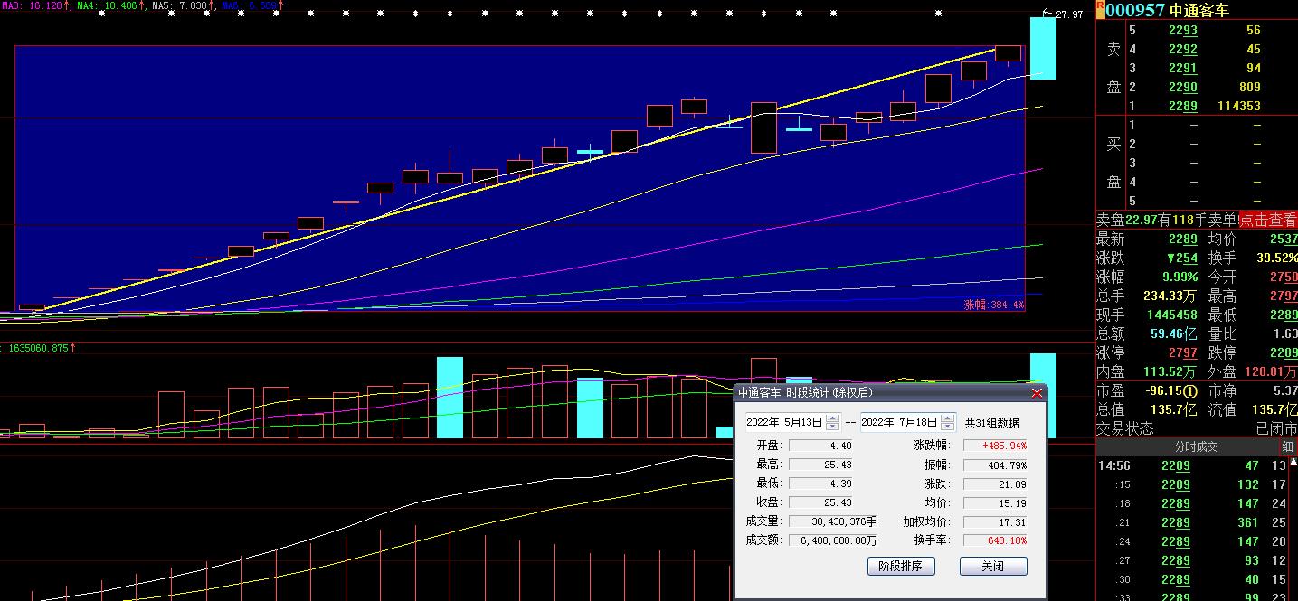 7月19日,熱門股中通客車早盤強(qiáng)勢(shì)拉升,一度漲停,午后跳水收于跌停,上演“天地板”走勢(shì)。截至收盤,報(bào)收于22.89元,當(dāng)日振幅達(dá)20%,換手率達(dá)39.52%。