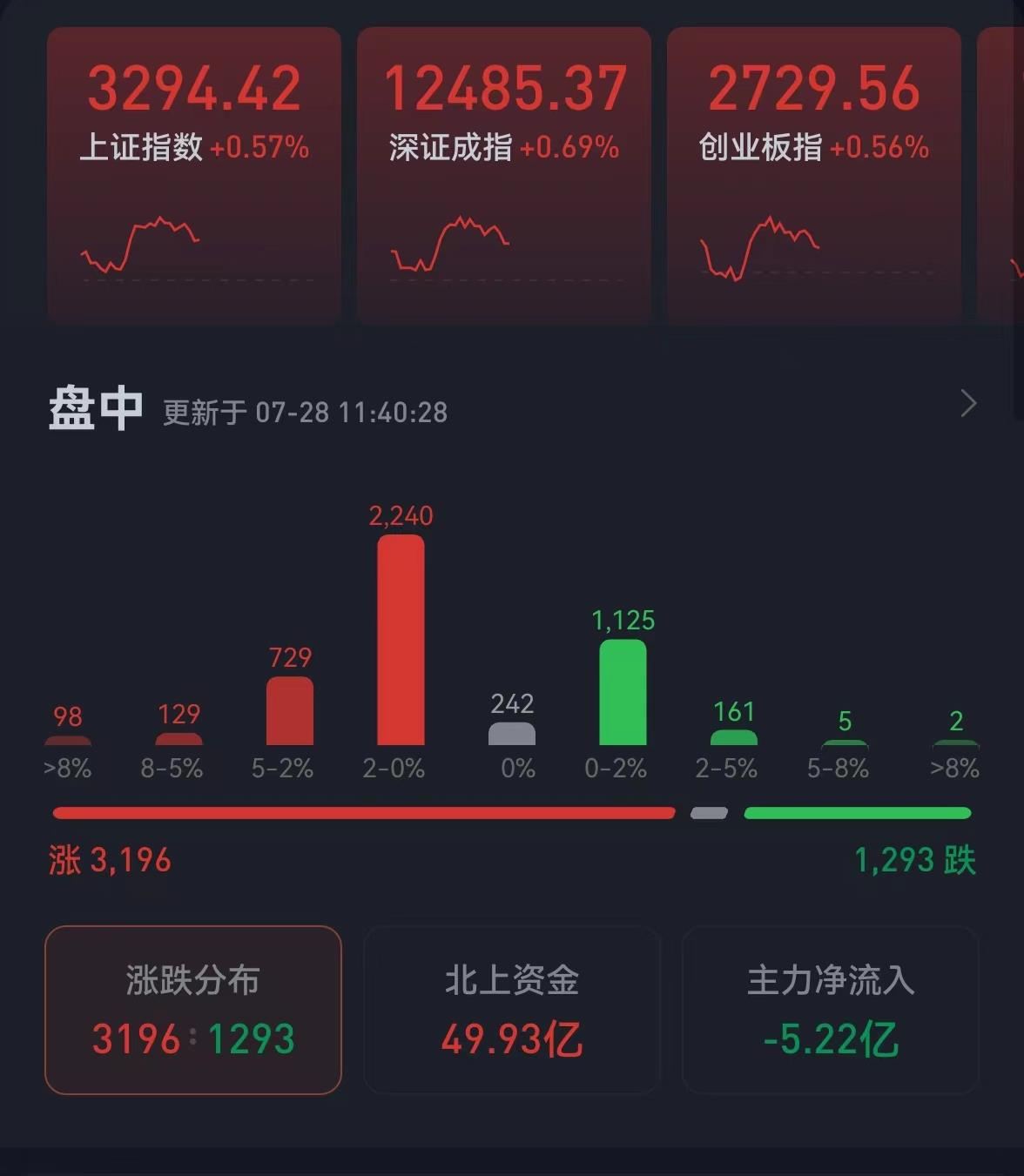 周四(7月28日),三大股指震蕩攀升,全線飄紅。截至上午收盤,上證指數漲幅達0.57%,報3294.42點;深證成指和創業板指漲幅分別為0.69%和0.56%;滬深兩市合計成交額6316.1億元。總體來看,兩市個股漲多跌少。