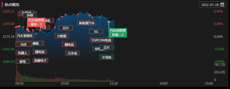 熱點板塊方面,截至7月28日上午收盤,電子設備、儀器儀表等板塊漲幅居前,倉儲物流、公共設施、房地產等板塊跌幅居前。