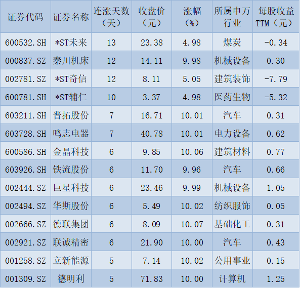 表:連續(xù)上漲5天且今日收盤漲停股一覽