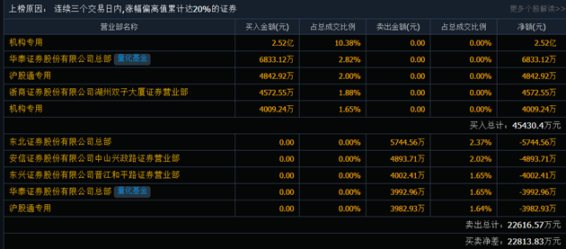 鳴志電器8月2日登上龍虎榜,同花順數(shù)據(jù)顯示,機(jī)構(gòu)專用賬號(hào)買入25172.57萬元,該賬號(hào)買入后,次日上漲概率50%,平均盈利0.42%。收益率最高的是持股1天后賣出,收益率0.42%,成功率50%。華泰證券股份有限公司總部買入6833.12萬元,該營業(yè)部買入后,次日上漲概率46%,平均盈利-0.02%。收益率最高的是持股1天后賣出,收益率-0.02%,成功率46%。