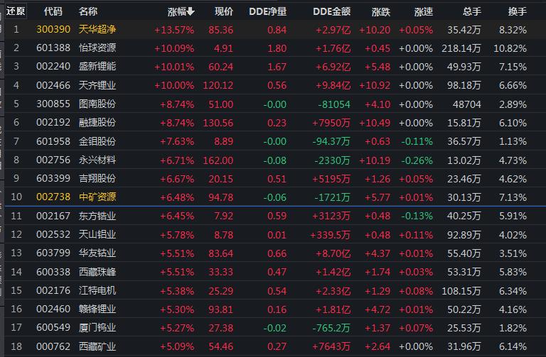 8月22日,有色金屬行業漲幅居首達3.72%。其中,怡球資源、盛新鋰能、天齊鋰業等3只概念股集體漲停。