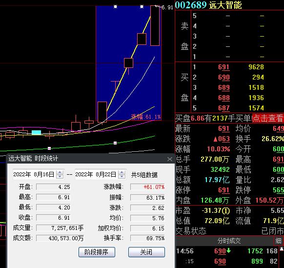 8月22日,熱門股遠大智能再度漲停,截至收盤,報6.91元,實現5連板累計漲幅達61.07%。