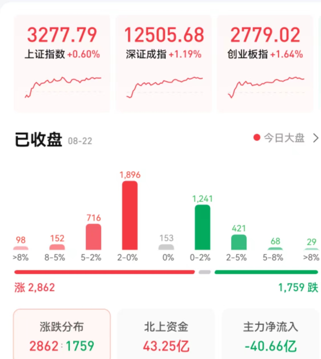 8月22日,三大股指全線飄紅,截至收盤,上證指數漲幅達0.6%報3277.79點,深證成指漲1.19%報12505.68點,創業板指漲1.64%報2779.02點;兩市合計成交10264億元,連續第5個交易日突破萬億元;北向資金凈買入43.25億元??傮w來看,A股個股漲多跌少。