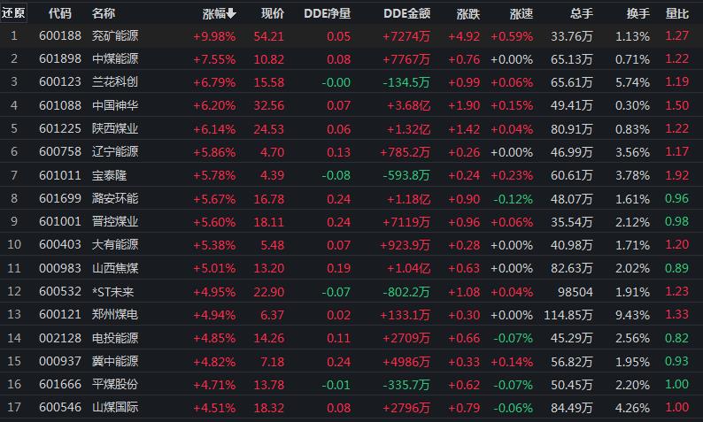 9月5日,煤炭行業漲幅居首達5.29%。其中,兗礦能源、中煤能源、蘭花科創、中國神華、陜西煤業等個股漲幅居前,均超6%。