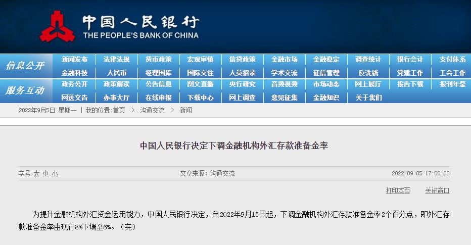 值得關注的是,今日收盤后,央行公布,下調金融機構外匯存款準備金率2個百分點。為提升金融機構外匯資金運用能力,中國人民銀行決定,自2022年9月15日起,下調金融機構外匯存款準備金率2個百分點,即外匯存款準備金率由現行8%下調至6%。