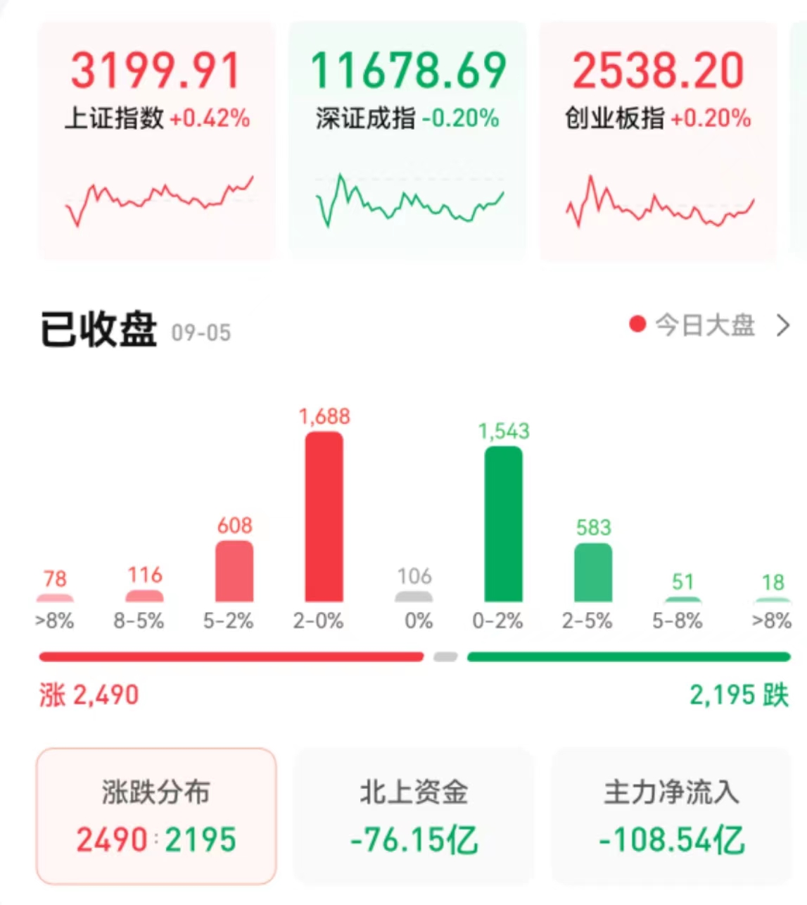 9月5日,A股三大指數震蕩分化,漲跌不一。截至收盤,上證指數漲幅達0.42%報3199.91點,深證成指跌0.2%報11678.69點,創業板指漲0.2%報2538.2點;兩市合計成交7697億元,北向資金凈賣出76.15億元。總體來看,A股個股漲多跌少。