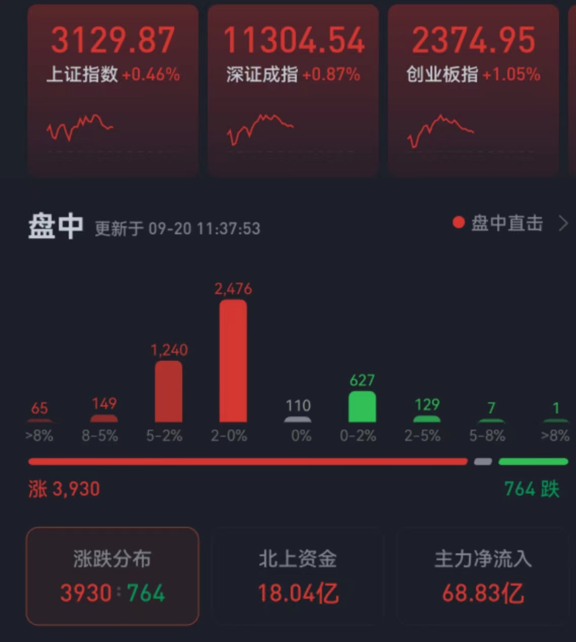周二(9月20日),三大股指震蕩反彈,全線飄紅。截至上午收盤,上證指數漲0.46%,報3129.87點;深證成指和創業板指漲幅分別為0.87%和1.05%;滬深兩市合計成交額4213億元,總體來看,兩市個股漲多跌少,近4000只個股實現上漲。