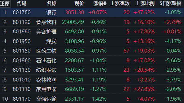申萬一級行業(yè)方面,31類行業(yè)中只有1類上漲,占比3.23%,其中,上漲的銀行業(yè)僅微漲0.07%;下跌方面,有色金屬、國防軍工和電力設(shè)備等行業(yè)居前三,跌幅分別為5.25%、3.75%和3.70%。