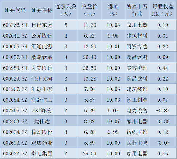 表:連續(xù)上漲3天且今日收盤漲停股一覽