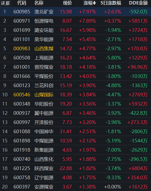 9月29日,申萬一級行業(yè)中煤炭行業(yè)領(lǐng)漲,漲幅達(dá)2.35%,獲得2.99億元大單資金的凈流入。行業(yè)38只交易中的個(gè)股,有31只上漲,占比81.58%,其中,4只個(gè)股漲幅超5%。
