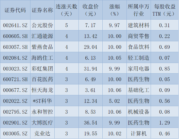 表:連續(xù)上漲3天且今日收盤漲停股一覽