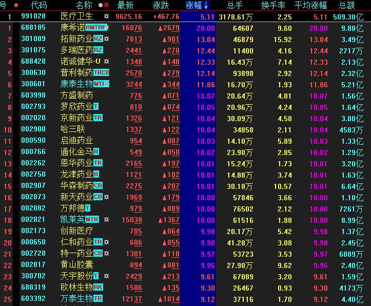 具體看,截至10月26日上午收盤,醫(yī)療衛(wèi)生板塊漲幅居首,達5.11%。其中,康希諾以20CM漲停報收,方盛制藥、羅欣藥業(yè)、京新藥業(yè)、華森制藥、黃山膠囊、龍津藥業(yè)等多只醫(yī)藥股批量漲停。