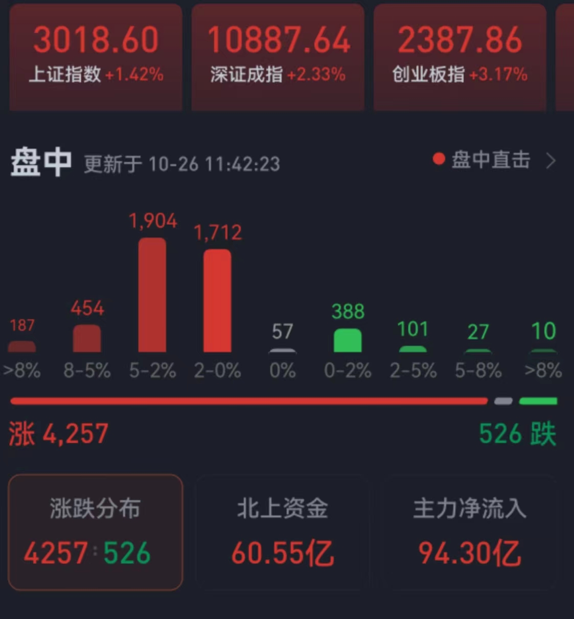周三(10月26日),三大股指震蕩反彈,全線飄紅。截至上午收盤,上證指數(shù)漲幅達1.42%,報3018.6點;深證成指和創(chuàng)業(yè)板指漲幅分別為2.33%和3.17%;滬深兩市合計成交額5741.5億元,總體來看,市場形成普漲格局,兩市個股漲多跌少,上漲個股達4257只,下跌個股526只,其中,有76只個股漲停,7只個股跌停。