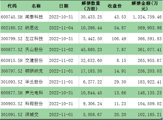 表:下周解禁市值前十位(本周收盤價(jià)計(jì)算)