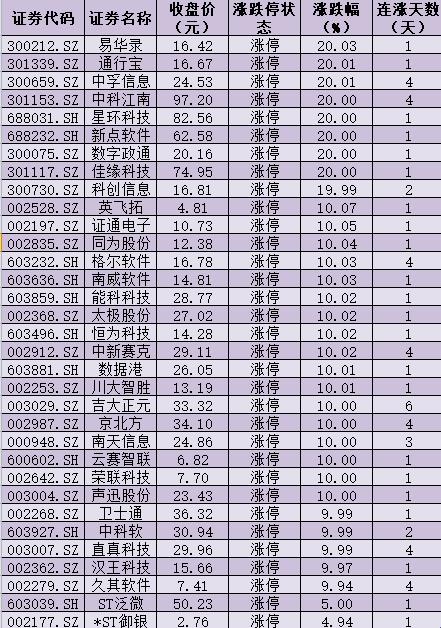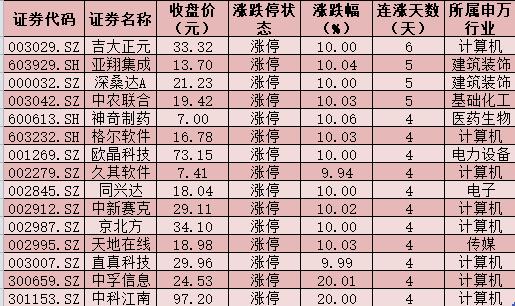 10月31日,計算機行業漲幅居首,達4.14%。33只概念股批量漲停,其中,易華錄、通行寶、中孚信息、中科江南、星環科技、新點軟件、數字政通、佳緣科技、科創信息等9只概念股均達20CM漲停。