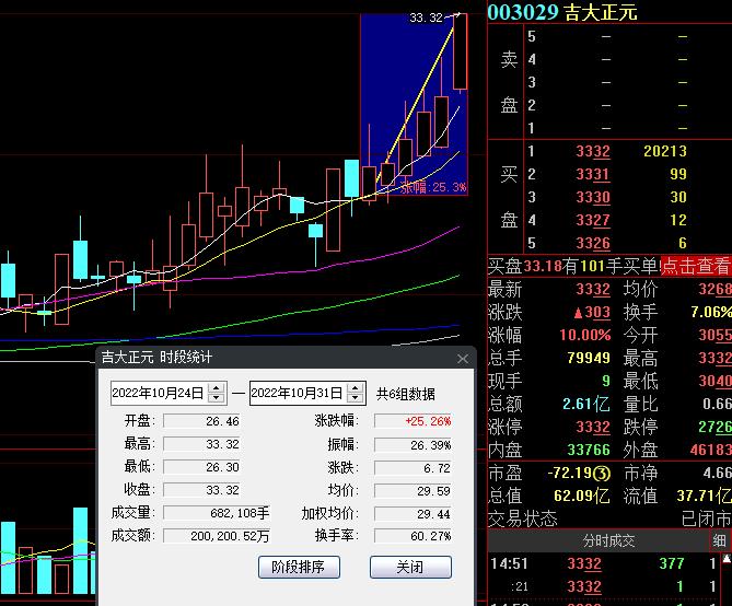 10月31日,吉大正元報收于33.32元,實現漲停,連續6個交易日上漲,期間累計漲幅達25.26%。