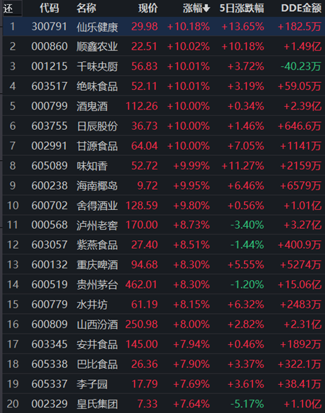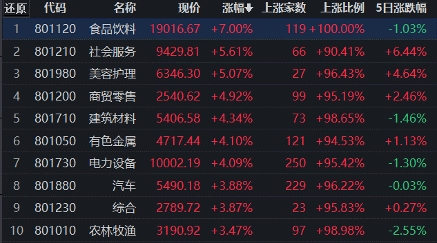 申萬一級行業中食品飲料行業領漲,漲幅達7.00%,獲得43億元大單資金的凈流入,居第一位。行業119只交易中的個股全線上漲,其中,51只個股漲幅超5%。