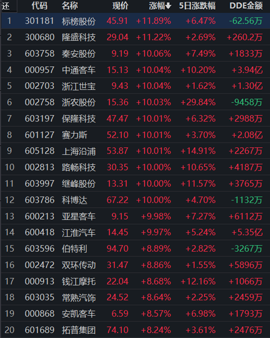 具體來看,汽車行業領漲,漲幅達3.31%,獲得23.26億元大單資金的凈流入,居第一位。行業237只交易中的個股,有220只上漲,其中,45只個股漲幅超5%。