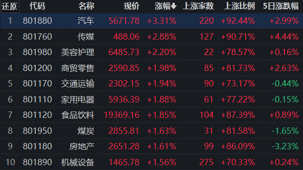 31類申萬一級行業中,有29類上漲,占比93.55%,其中,汽車漲3.31%,居首;下跌方面,僅國防軍工和銀行兩行業下跌,跌幅分別為0.49%和0.06%。