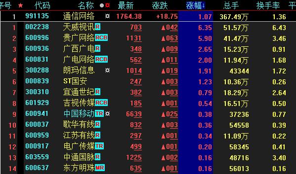 具體看,截至11月8日上午收盤,通信網絡板塊表現強勢,漲幅居首達1.07%。其中,天威視訊、貴廣網絡等概念股漲幅居前,均超5%。