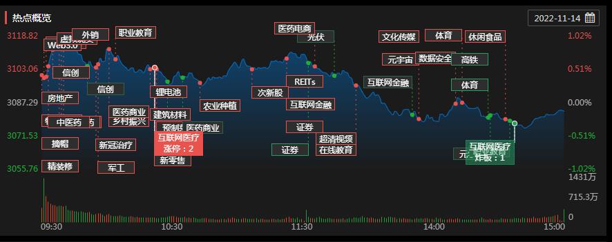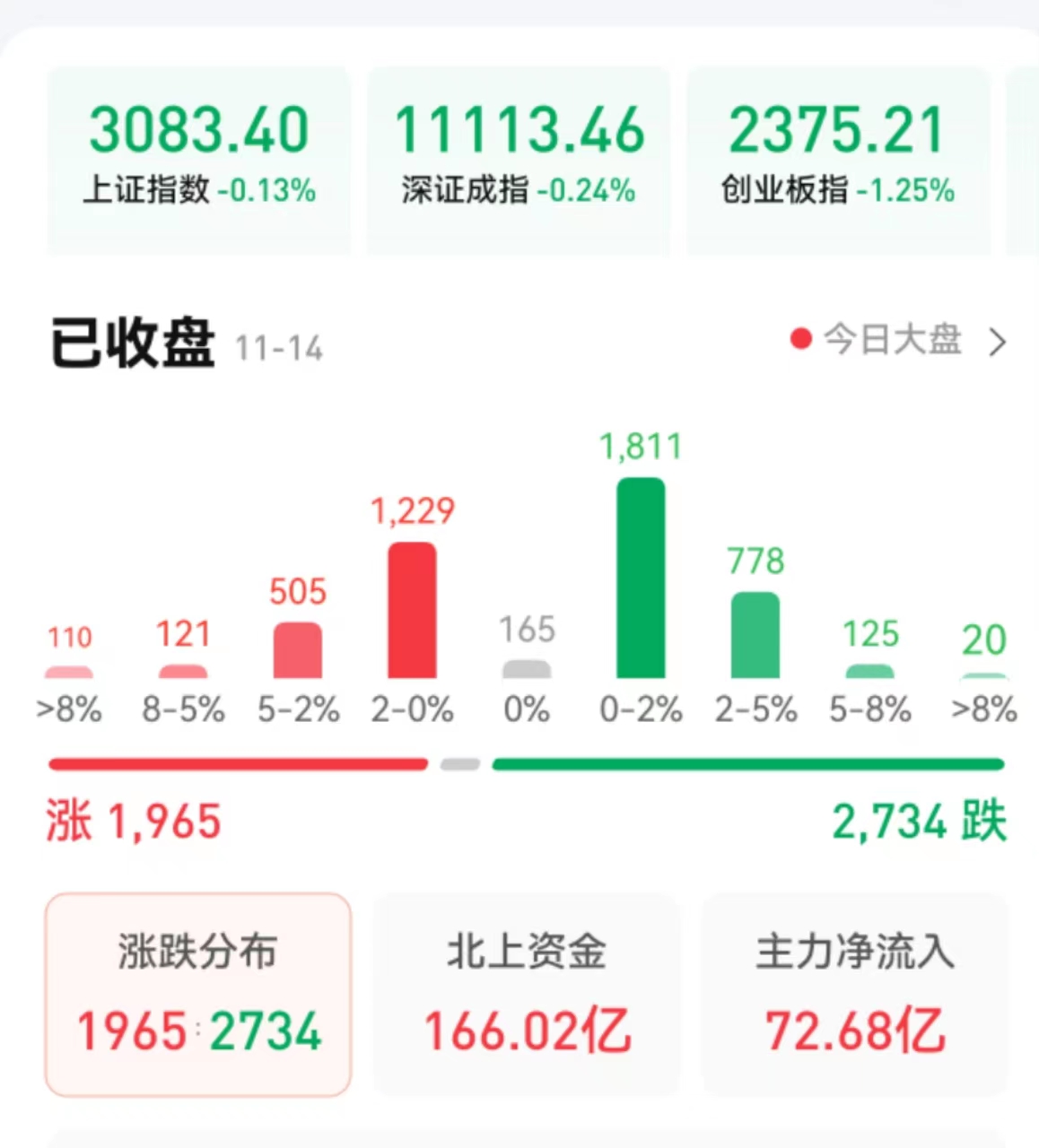 周一(11月14日),A股三大指數震蕩回落。截至收盤,上證指數跌幅達0.13%報3083.4點,深證成指跌幅達0.24%報11113.46點,創業板指跌幅達1.25%報2375.21點,上證50指數逆市漲0.8%;兩市合計成交10673億元,北向資金凈買入166.02億元。總體來看,兩市個股跌多漲少。