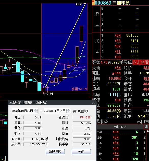 11月14日,熱門股三湘印象再度漲停,截至收盤,報4.84元,連續11個交易日上漲,累計漲幅達54.63%。