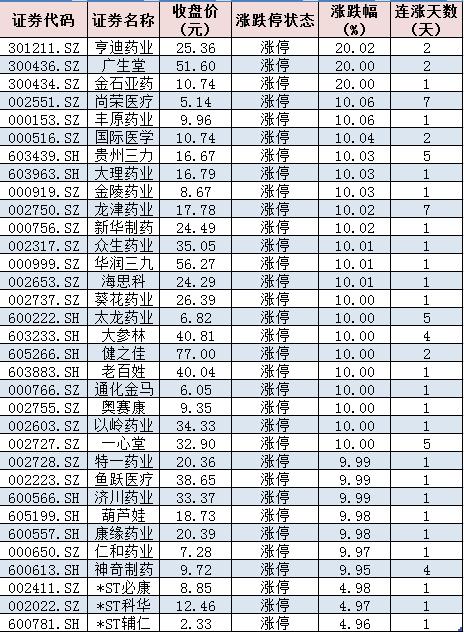 周一(11月14日)醫藥生物行業中33只漲停股情況: