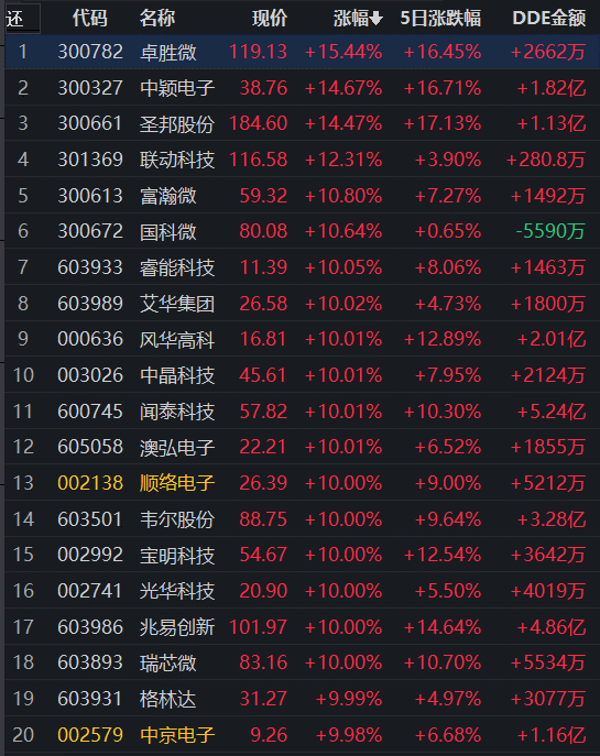 具體來看,電子行業(yè)領(lǐng)漲,獲得76.32億元大單資金的凈流入。行業(yè)中304只交易中的個(gè)股,有299只上漲,占比98.36%,其中,94只個(gè)股漲幅超5%。
