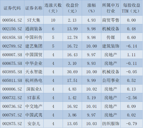 漲停方面,有62只個股以漲停價報收,其中,有13只漲停股股價已連續上漲超過4個交易日;跌停方面,有9只個股跌停價報收。從申萬一級行業看,房地產行業漲停股數量居首,達9只,緊隨其后的是醫藥生物,漲停股數為7只。