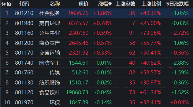 31類申萬一級行業中,有5類上漲,其中,社會服務漲幅達1.86%,居首,美容護理和公用事業緊隨其后;下跌方面,銀行跌幅居前,下跌1.85%。