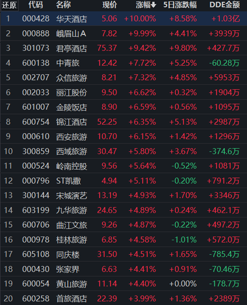 標的方面,東莞證券表示,國內防疫工作優化逐步推進,旅游出行信心有望逐漸修復。國際航線客運力同比增長近九成,出入境限制逐漸松動,推薦優先受益于出入境限制放松的出境游龍頭眾信旅游(002707);機場免稅業務有望復蘇的免稅龍頭中國中免(601888);建議布局業績彈性較大的景區個股云南旅游(002059)、天目湖(603136)、宋城演藝(300144);建議關注具有餐飲宴會+預制菜成長屬性的同慶樓(605108)等。