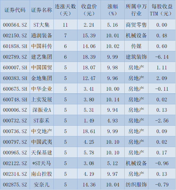 漲停方面,有114只個股以漲停價報收,其中,有16只漲停股股價已連續上漲超過5個交易日;跌停方面,有1只個股跌停價報收。從申萬一級行業看,房地產行業漲停股數量居首,達42只,緊隨其后的是社會服務(12只)和醫藥生物(10只)。