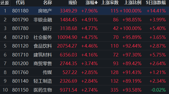 31類申萬一級行業中,有30類上漲,其中,房地產漲幅達7.96%,居首,非銀金融和銀行緊隨其后;下跌方面,僅公用事業下跌,跌幅0.49%。