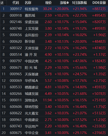 11月29日,申萬一級行業中房地產行業領漲,漲幅達7.96%,獲得40.15億元大單資金的凈流入,居資金流入行業第4位。行業中115只交易中的個股,全線上漲,其中,82只個股漲幅超5%。