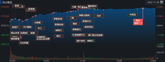 截至11月29日收盤,上證指數漲2.31%,收報3149.75點,深證成指漲2.40%,收報11089.01點,創業板指漲1.78%,收報2339.79點;滬深兩市合計成交額9681.2億元,較前一交易日增長27.65%;北向資金凈買入98.06億元;總體來看,A股中上漲個股為4193只,下跌個股740只。