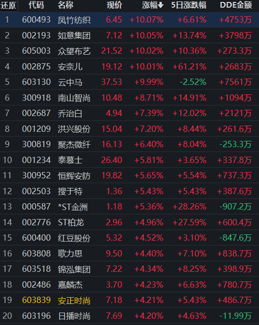 12月2日,申萬(wàn)一級(jí)行業(yè)中紡織服飾行業(yè)領(lǐng)漲,漲幅達(dá)1.76%,獲得5858萬(wàn)元大單資金的凈流入,居資金流入行業(yè)第5位。行業(yè)中113只交易中的個(gè)股,有102只上漲,其中,13只個(gè)股漲幅超5%。