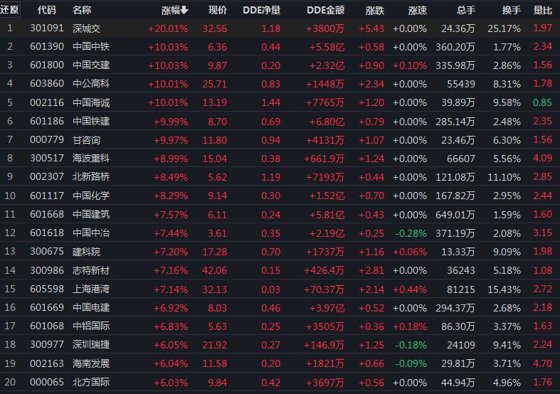 12月5日,建筑裝飾行業漲幅居首,達4.76%。其中,中國海誠、中國交建、甘咨詢、中國鐵建、中國中鐵、中公高科、深城交等7只概念股集體漲停。