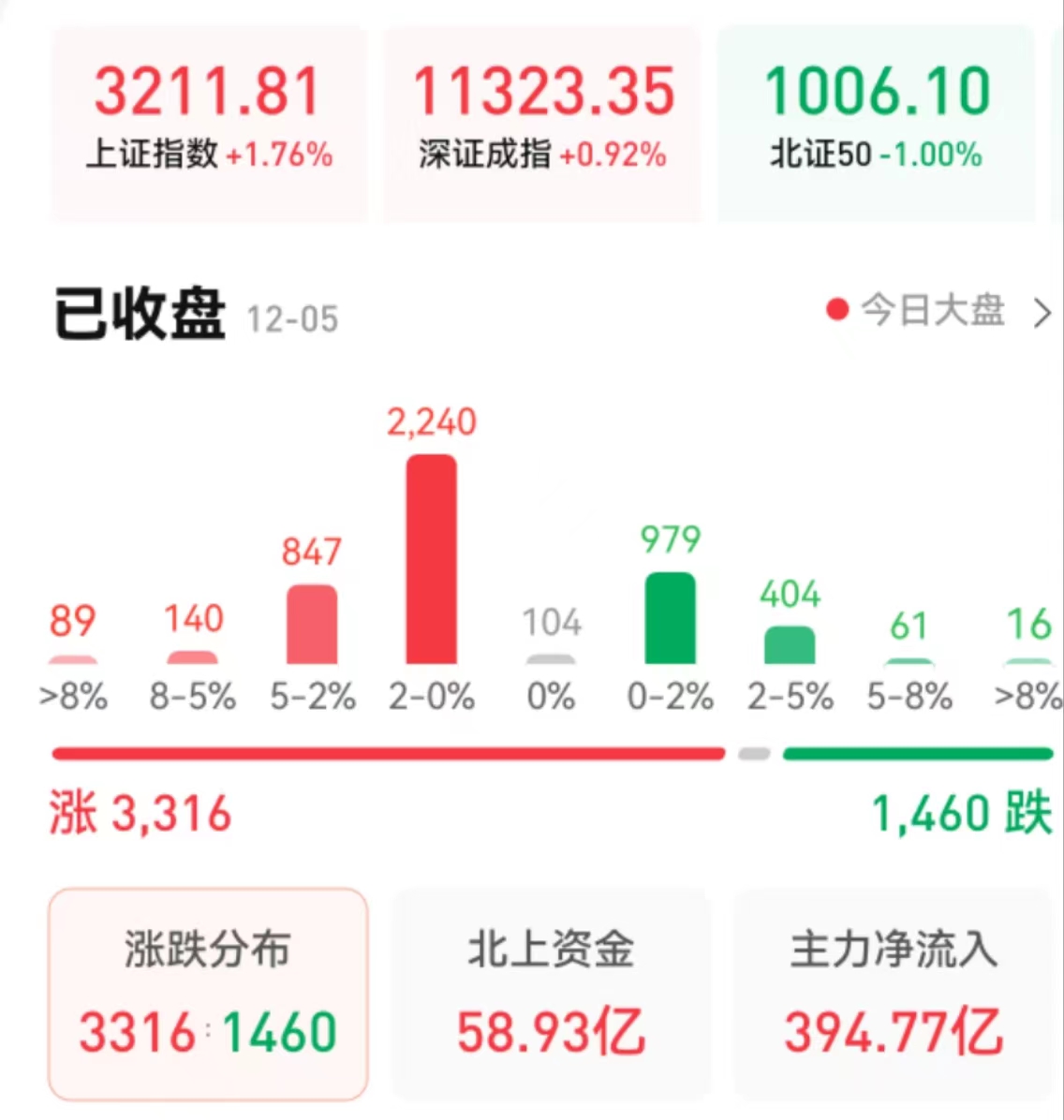 周一(12月5日),A股三大指數震蕩分化。截至收盤,上證指數漲1.76%報3211.81點,深證成指漲0.92%報11323.35點,創業板指跌0.26%報2377.11點;滬深兩市合計成交額突破萬億元,達10551億元。北向資金凈買入58.93億元。總體來看,兩市個股漲多跌少。
