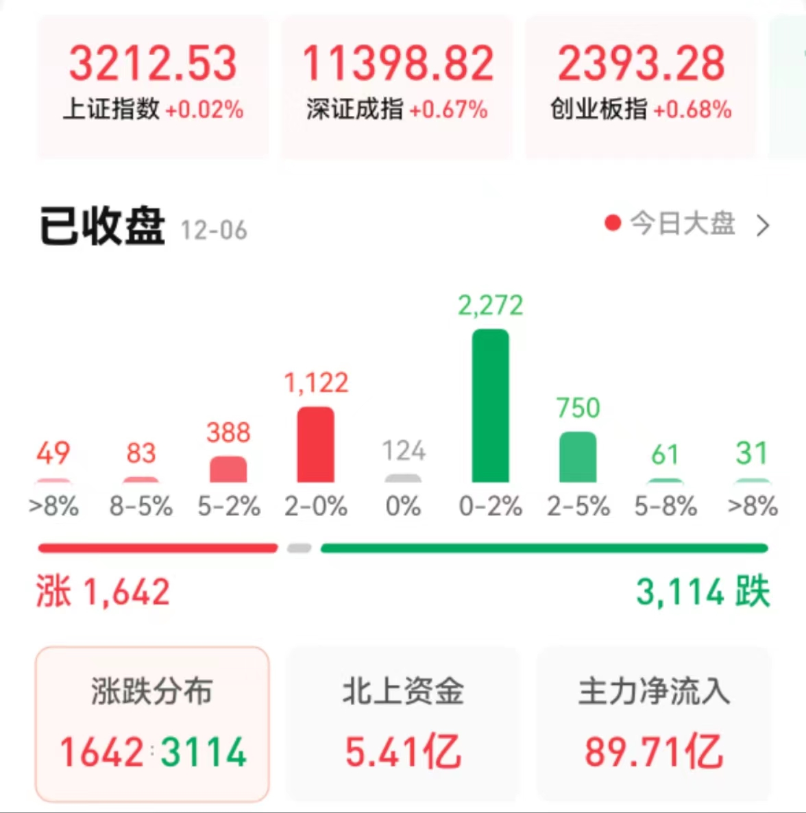 12月6日,A股三大指數(shù)震蕩攀升,全線飄紅。截至收盤,上證指數(shù)微漲0.02%報3212.53點,深證成指漲0.67%報11398.82點,創(chuàng)業(yè)板指漲0.68%報2393.28點;兩市合計成交額接近萬億元,達9982億元,北向資金凈買入5.41億元。總體上看,市場交投熱度略有減少,下跌個股超3000只。