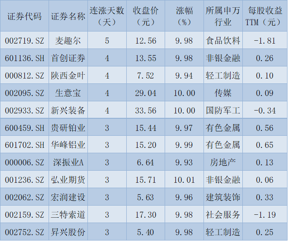 表:連續(xù)上漲3日且今日收盤漲停股一覽