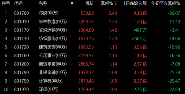 12月30日,行業板塊呈漲多跌少格局。從31類申萬一級行業看,有26類行業上漲,5類行業下跌。漲幅方面,傳媒行業居首達2.43%,農林牧漁和交通運輸居第二、三位。跌幅方面,有色金屬居首,跌幅達0.47%,此外,醫藥生物、電子、電力設備和鋼鐵等行業也出現小幅下跌。