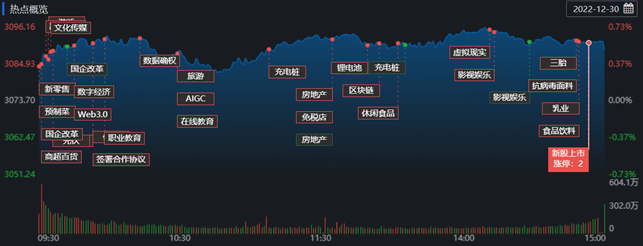 今日,A股三大指數高開后震蕩分化,滬指收復60日均線,為2023年開門紅留下想象空間。截至收盤,上證指數漲0.51%報3089.26點;深證成指漲0.18%報11015.99點,創業板指跌0.11%報2346.77點,A股合計成交額6038.88億元,較前一交易日縮減1.75%,北向資金凈買入0.93億元。總體上看,A股個股漲多跌少,有3318只上漲,1557只下跌。