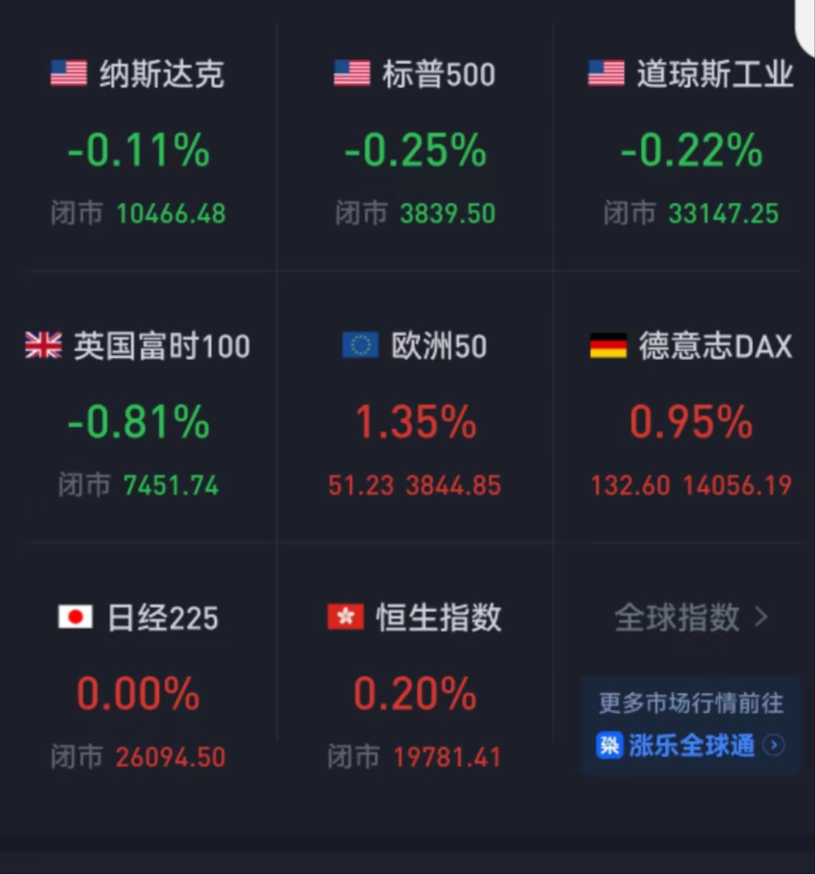 上周五,歐股收盤全線下跌,德國DAX指數跌1.05%報13923.59點,全年累跌12.35%;法國CAC40指數跌1.52%報6473.76點,全年累跌9.5%;英國富時100指數跌0.81%報7451.74點,全年累漲0.91%。