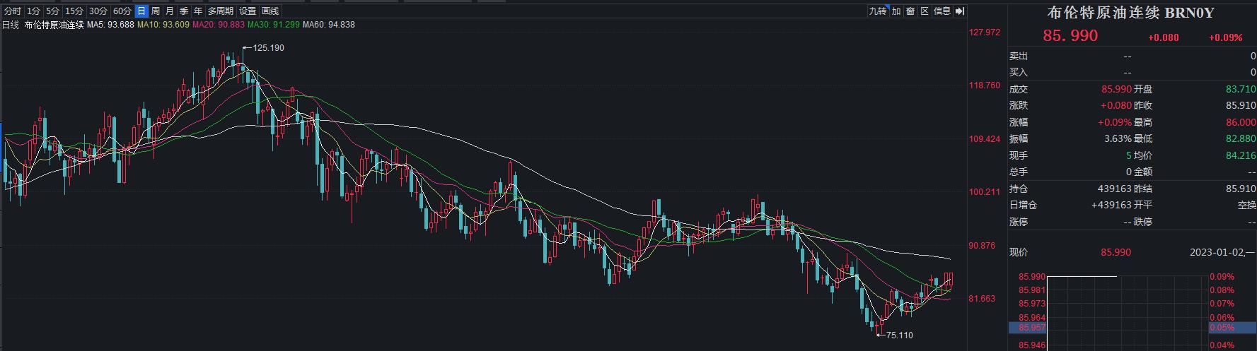 上周五,國際油價全線上漲,美油2023年2月合約漲2.69%,報80.51美元/桶,年漲7.05%。布油2023年3月合約漲3.03%,報85.99美元/桶,年漲10.56%。